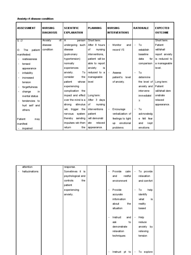 The client will verbalize ways to intervene in escalating anxiety within 1 week. Nursing care plans for anxiety disorders nursing care plan 1 nursing diagnosis: This nursing care plan is for patients with anxiety. Anxiety may be caused by certain deep situations and events of our life like staying unaware of the problem, conflicts of mind, and heart. See full list on nursestudy.net